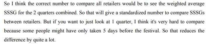 Their customers’ consumption is highly episodic — clustering around major festivals and weddings. That makes year-on-year comparisons extremely misleading, and easy to misinterpret. This is why, curiously, these companies are almost pleading with investors not to over-index on their exceptional quarterly numbers. V2, for instance, insists that you should ignore the quarter’s same store sales numbers, and look at their average growth figures over two quarters instead.