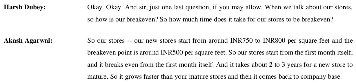 Is this strategy risky? Perhaps. But if V2 is to be believed, the economics simply make sense. Expansions appear to pay for themselves. Any new store they open, it appears, breaks even from the very first month. Against a breakeven point of ₹500 per square foot, the average new store begins with more than ₹750 in sales per square foot — and only grows from there.