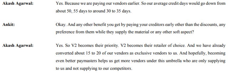 Different companies are taking different approaches to this problem. For instance, V2 is trying to become the best paymaster in the industry — paying them early, even at the cost of stretching their own working capital. Financially, this is inconvenient for V2. But it makes them their vendors’ favourite customer, and even gets some suppliers to supply exclusively to them.