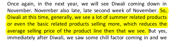 This affected their results — although it’s hard to understand by how much. The behaviour of a consumer can turn on a dime, creating weirdness that complicates the financial numbers of any consumer-facing business. V-Mart’s management, for instance, gave us an interesting example: since Diwali came earlier than usual this year, a lot of Diwali-shoppers bought light, summer-friendly clothes — instead of relatively expensive winter-wear pieces. Right as demand hit its peak, the company’s average selling price fell.