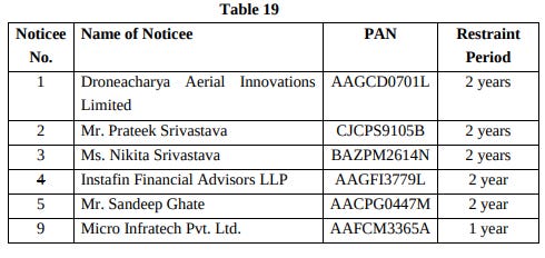 SEBI has restrained DroneAcharya, its promoter-directors Prateek and Nikita Srivastava, and a series of other entities from accessing the securities market. The bans range from one year (in Micro Infratech’s case) to two years for the others. They are also prohibited from buying or selling securities, except to close out existing positions under specific conditions.