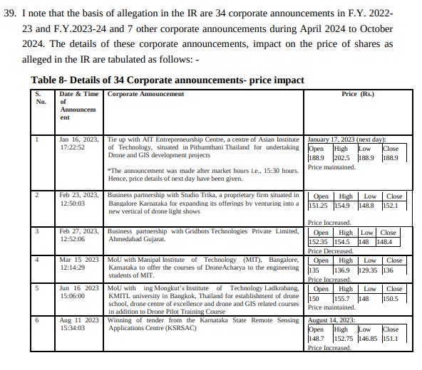 One announcement said that the company had “secured” India’s largest FPV drone export order worth ₹15 crore from a firm called MBD. Only, SEBI found that this “customer” was effectively a one-man company — and that the foreign remittance attempts associated with the supposed export were rejected. The company never disclosed that the order had collapsed.
