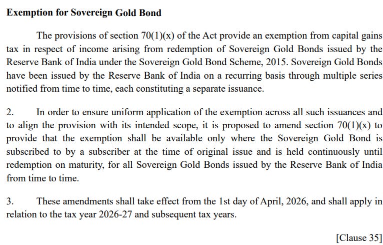 Then, there are changes to how Sovereign Gold Bonds (SGB) will be taxed. They continue to enjoy tax-free capital gains on redemption, as they were before. But the Budget makes one important clarification, which effectively reduces who can avail that benefit. The exemption is now explicitly limited to investors who subscribed to the bond at the time of original issuance and held it continuously until maturity. So, if you buy an SGB from the secondary market and later redeem it, your gains will be taxed like any normal capital gains.