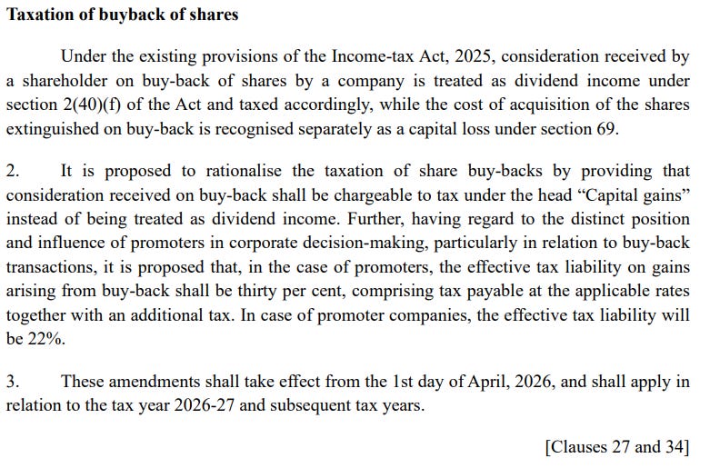 There is, however, a clear distinction for a company’s promoters, because they get a say in whether and when a buyback happens — opening the doors to misuse. And so, the Budget introduces an additional tax layer for them. And so, promoter gains from buybacks are taxed at an effective rate of 22% for corporate promoters and 30% for non-corporate promoters.
