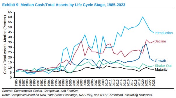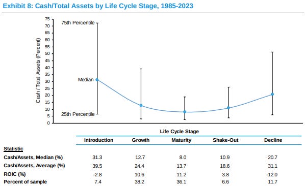 As companies mature, with established operations and steady cash flows, their cash holdings drop to just 8% of their assets.