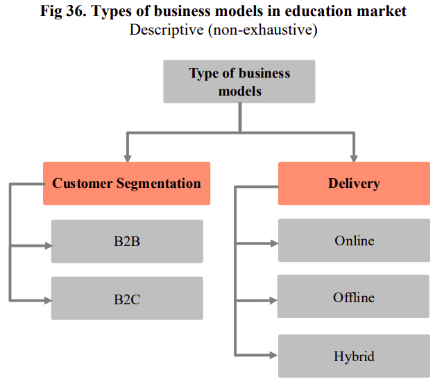 Business models also differ by mode of delivery. Some stick to the traditional offline setup — physical classrooms like the schools we all went to. Others go fully online, delivering learning through apps, websites, and virtual classrooms. Then there’s the increasingly popular hybrid model, where most of the learning happens online, but students also get in-person support — say, through doubt-clearing sessions or weekend classes.