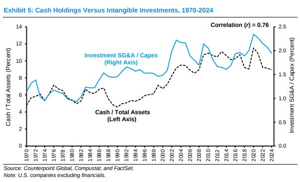 That’s partly why companies have so much more cash these days. Since the 1970s, American companies have been investing far more in intangibles like patents and other forms of knowledge. And that’s around when companies started holding on to more cash.