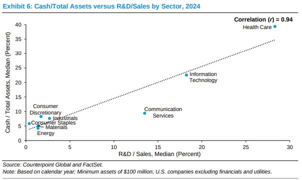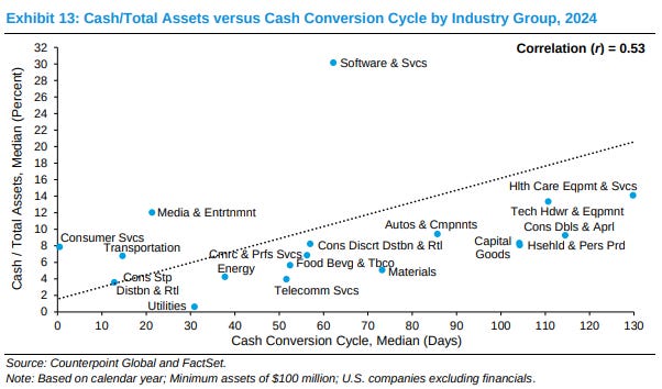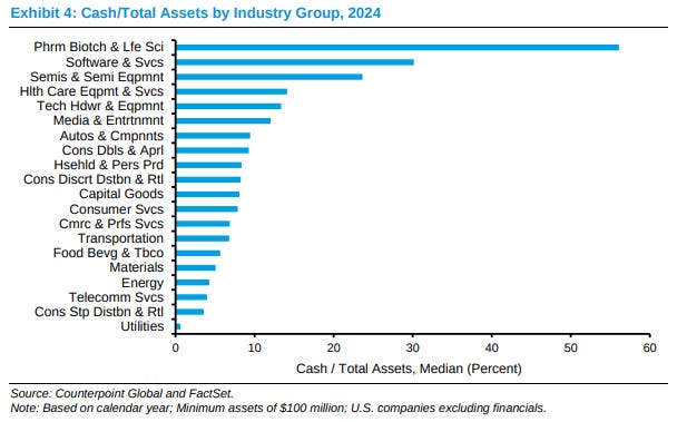 At the other end of the spectrum, traditional industries like energy, at 4%, and utilities, at less than 1%, maintain far leaner cash positions.