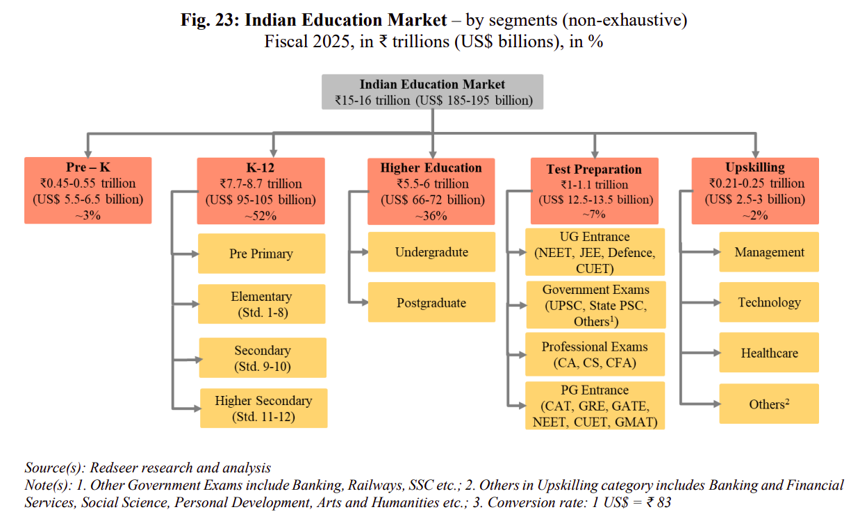 Think about it: it begins with pre-K, the preschool programs that introduce toddlers to learning. Then comes K–12, the schooling years from kindergarten to class 12. This is the biggest slice of India’s education pie, making up more than half of the ₹15 lakh crore market. And it makes sense — as of 2024, India has nearly 37 crore school-going children.