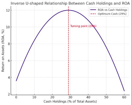 There are, in fact, certain optimal levels of cash for companies. A paper by three Australia-based researchers finds that cash improves firm performance up to a point, after which, it declines. That point, to them, is 29% of assets: below that, the return on assets improves. More than that, returns fall. In other words, there’s an inverse U-shaped curve to how much cash you should have.