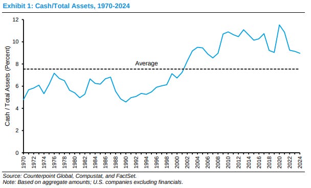 But lately (and interestingly), companies across the world have recently been holding way more cash than they might ever need. Listed US companies held nearly $2.5 trillion in just cash at the end of 2024 — about 4.7% of their total market cap. From 5.8% in the thirty years between 1970-2000, cash has risen to ~9.7% of companies’ assets between 2001-2024.
