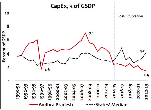 This debt burden draws limits around what Andhra can invest in. And so, while Andhra has courted massive private sector investments, it’s unable to carry out much capex of its own — even falling short of budget estimates. In fact, the state has seen an exceptionally weak level of capex growth over its history, relative to its economic output. Only now is it growing the level of its investment, but those numbers only look good againt a very low starting point.