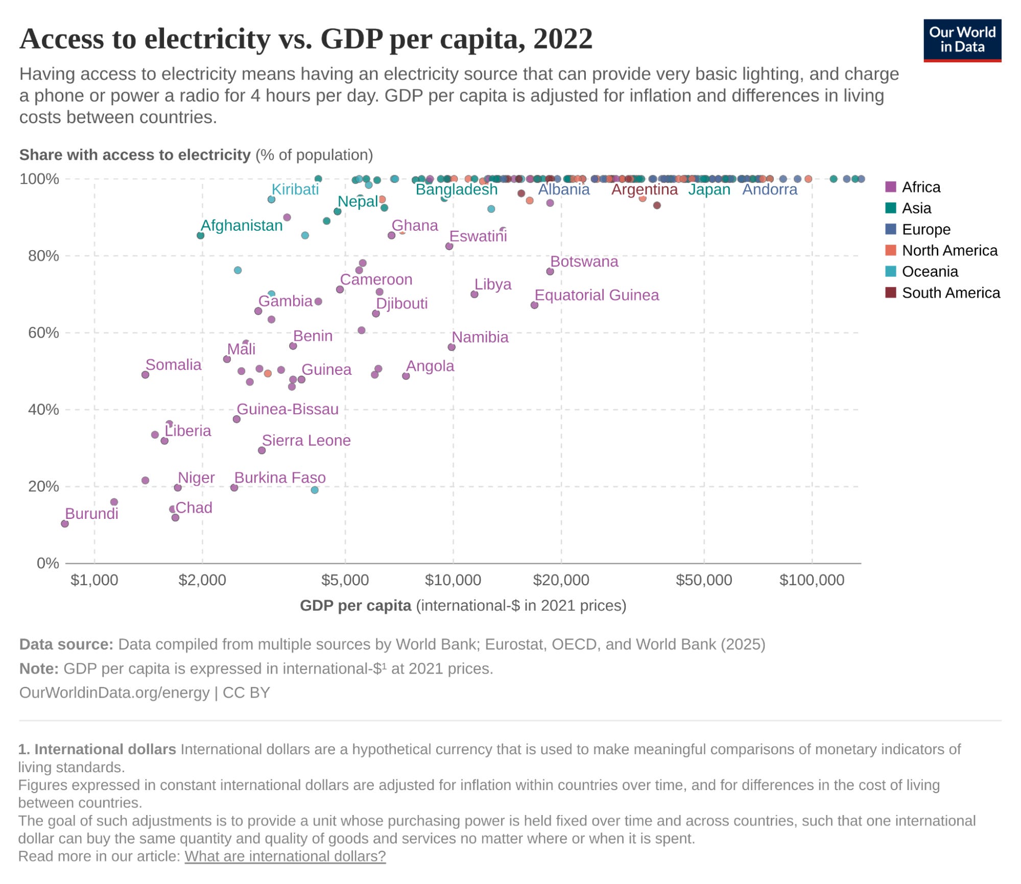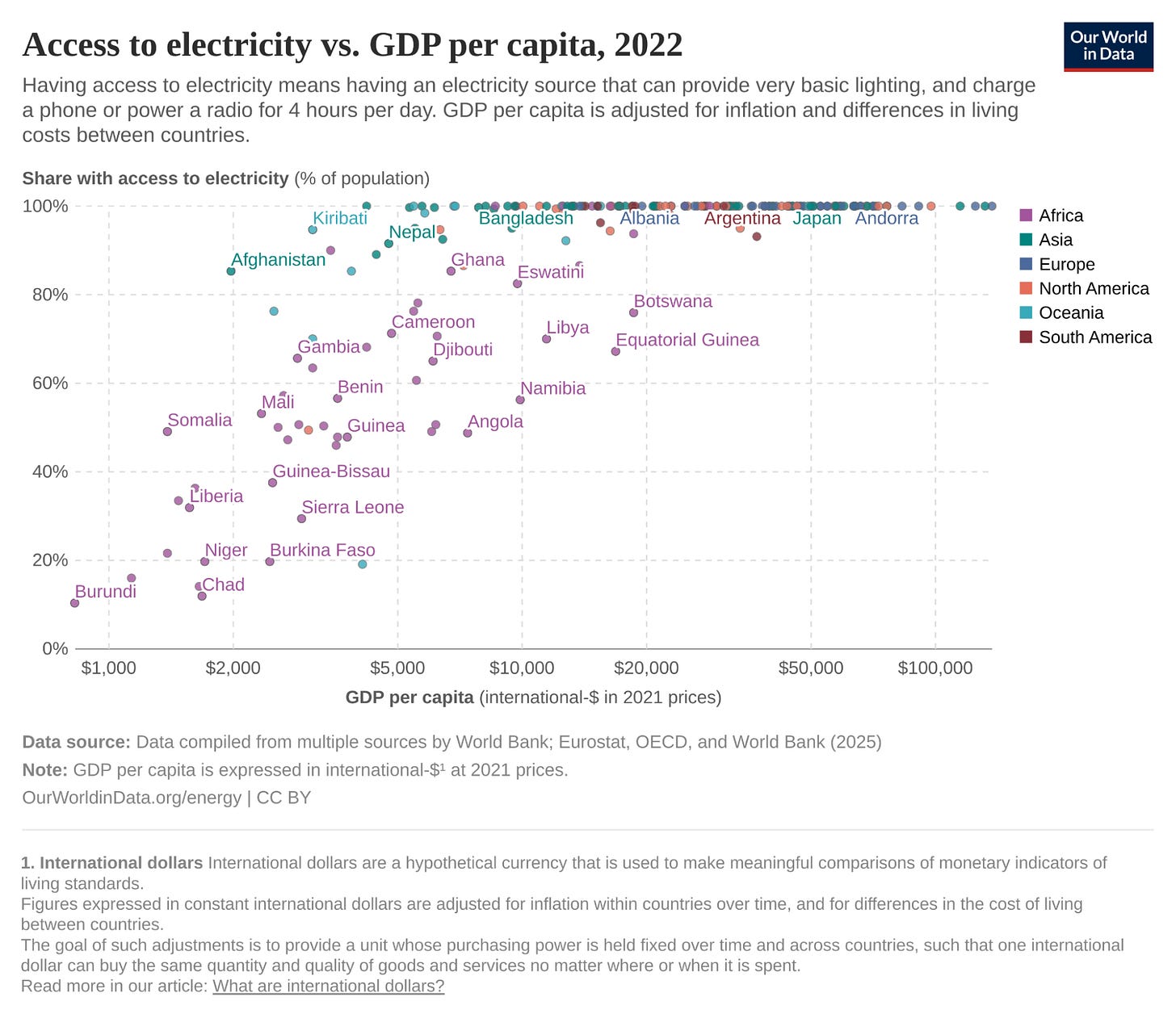 Interestingly, in parts of the world like ours, the rates of energy poverty are often higher than income poverty. That is, even people that live decent lives by our standards, objectively, live a poor standard of life. They may have no refrigeration to preserve food, no lighting for evening activities, no power for productive equipment.