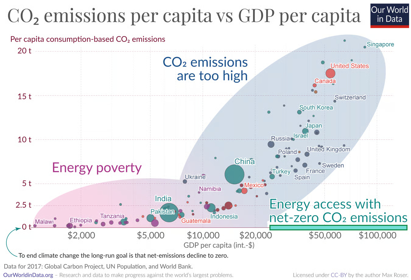 That leads us to what Our World in Data calls the world's “twin energy problems”. On one hand, some countries have exceptionally low emissions — but that's basically because their people live in poverty, and can barely meet their basic energy needs. On the other, countries that provide good living standards to their citizens can only do so at the cost of a massive carbon footprint.