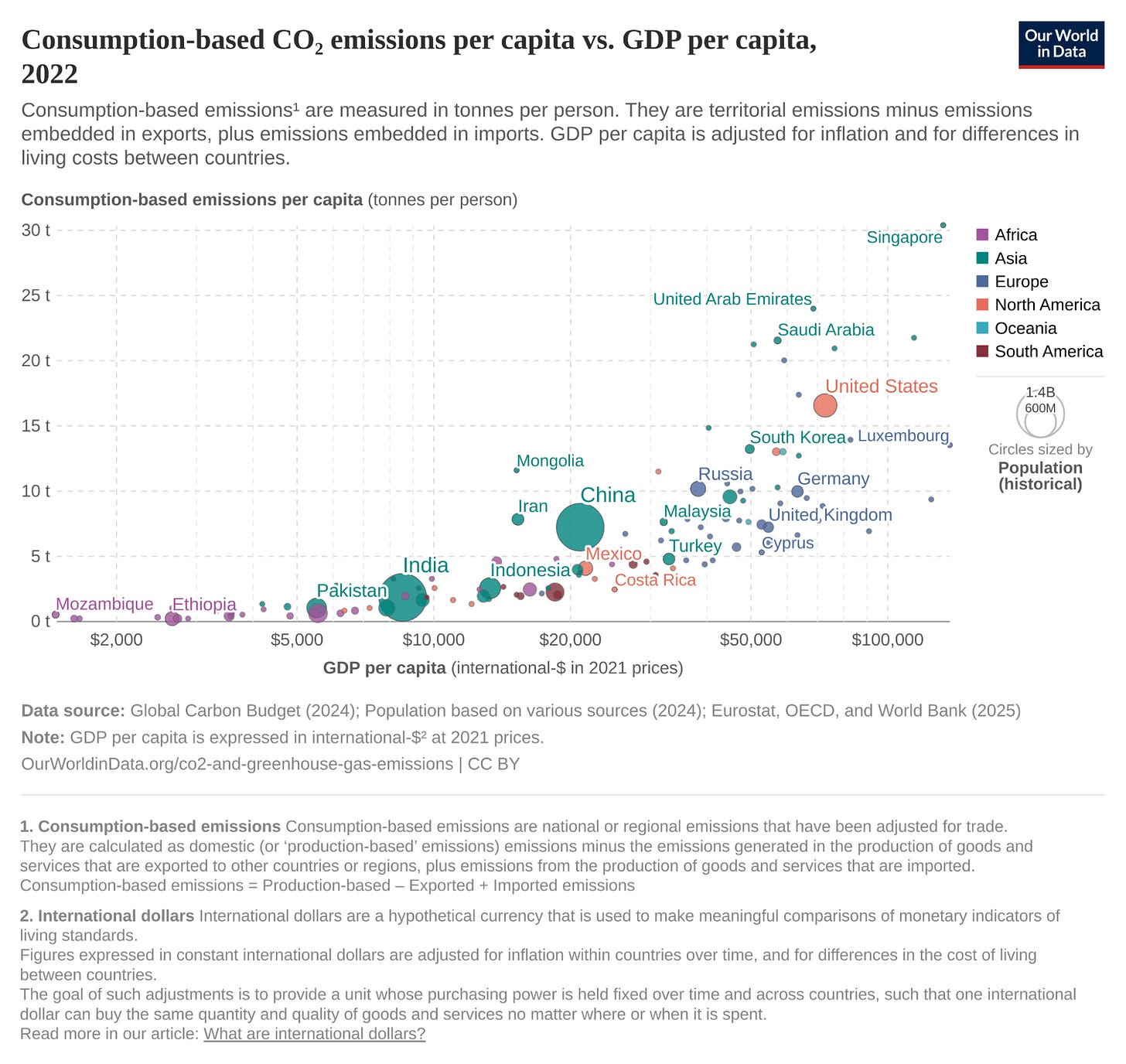 Look at this chart. Poor countries cluster in the bottom left — with both low emissions and low income. Rich countries are at the opposite end of the graph.