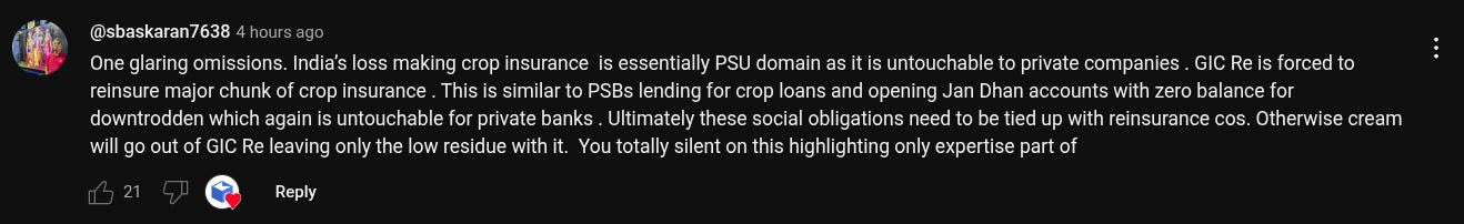 Turns out, we missed a very important piece of context. One of our YouTube subscribers, @sbaskaran7638, made an insightful comment about an important drag on GIC Re’s business — crop insurance.