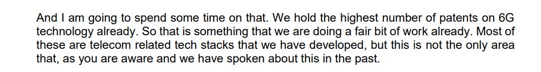 This is already an impressive roll-out. And Jio seems to be doubling down on wireless internet. Not only have they partnered with SpaceX to distribute Starlink's high speed internet services in India, they’re also racking up 6G patents. Here’s what they’ve said in their concall: