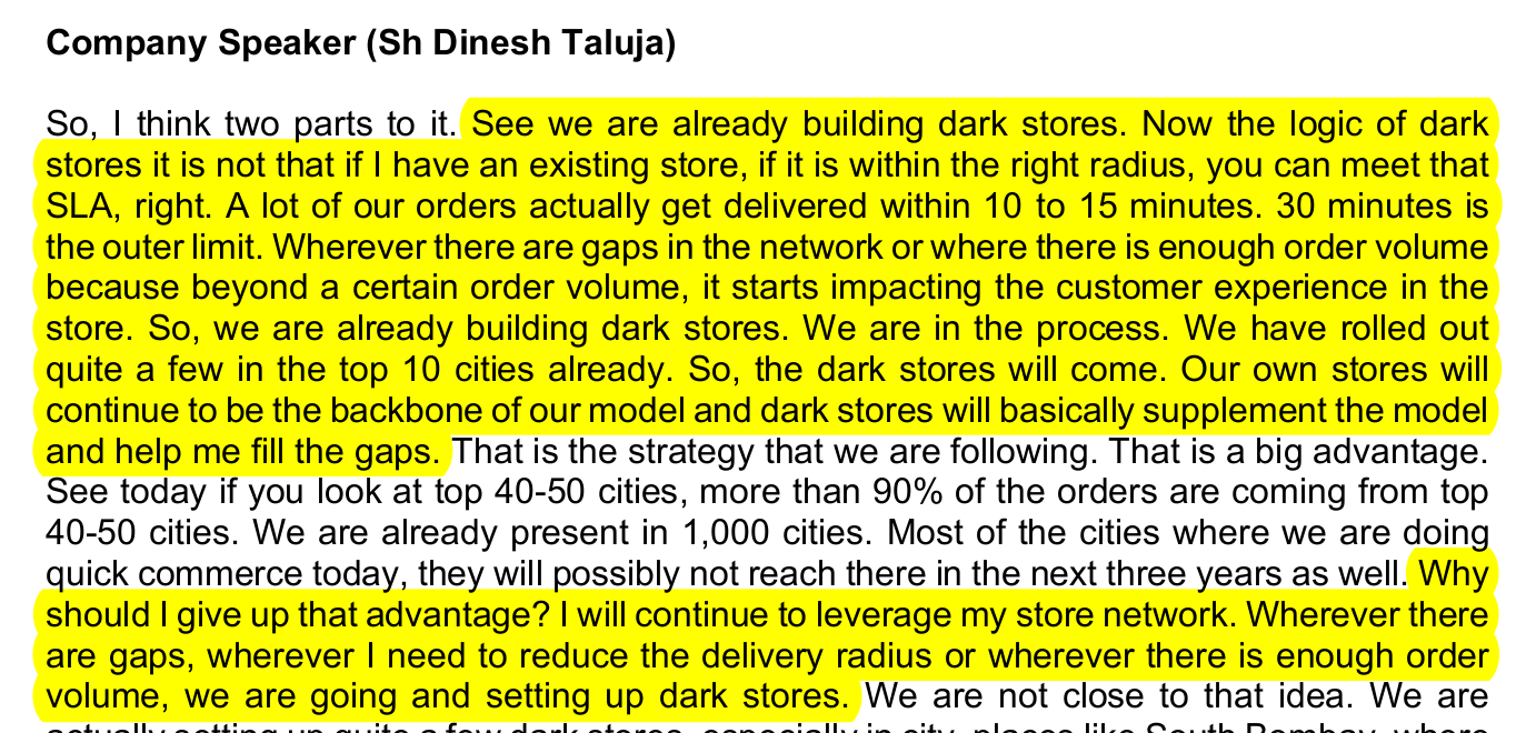 Quick commerce companies usually only operate through dark stores. Reliance, though, is turning to its huge and ever-expanding network of retail stores. They’re only adding dark stores to fill gaps if their offline coverage falls short. This gives them a presence in far more cities than their competitors, and in each of those places, they get the benefit of both quick commerce and their traditional retail business.