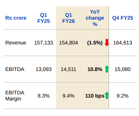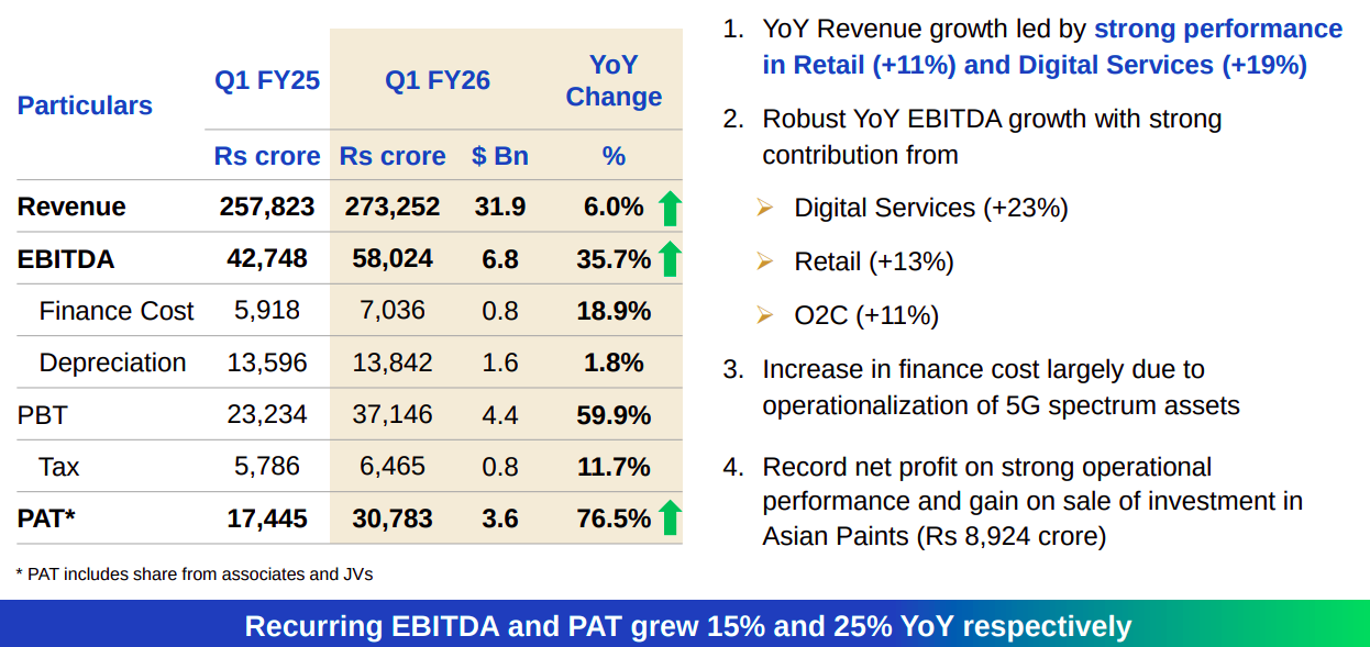 That said, even once you ignore the Asian Paints sidenote, Reliance delivered a solid quarter. Without it, it still delivered a solid 15% EBITDA growth, with 25% PAT growth – respectable numbers that reflect genuine business momentum.