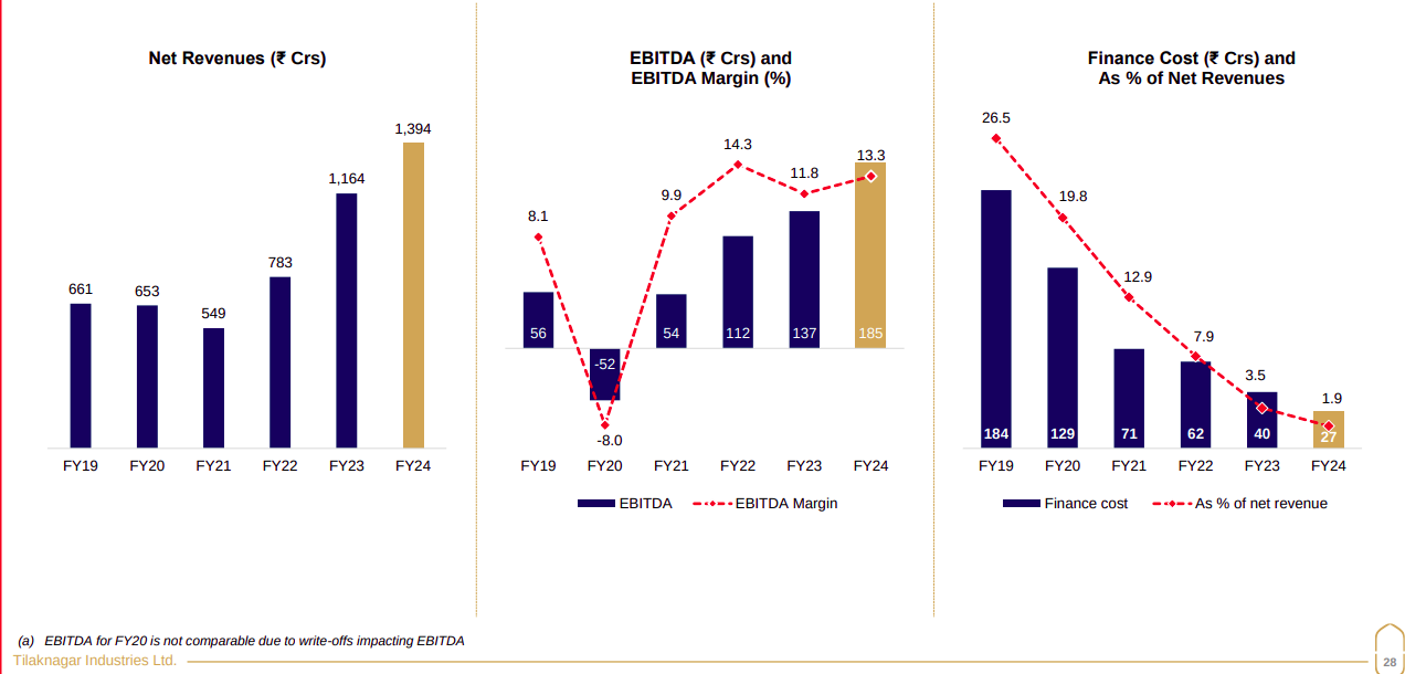 Not very long ago, Tilaknagar was sinking in debt. But it pulled off a remarkable turnaround, and is now in solid financial health. From FY19 to FY24, their net revenues have more than doubled to ₹1,394 crores. Their EBITDA margins, too, have improved from 8.1% to 13.3%. And where over a quarter of their revenue would previously go into paying debt, that number has dropped to 2%. It will raise debt to finance this deal, but it now has enough fire-power to sustain that debt burden.