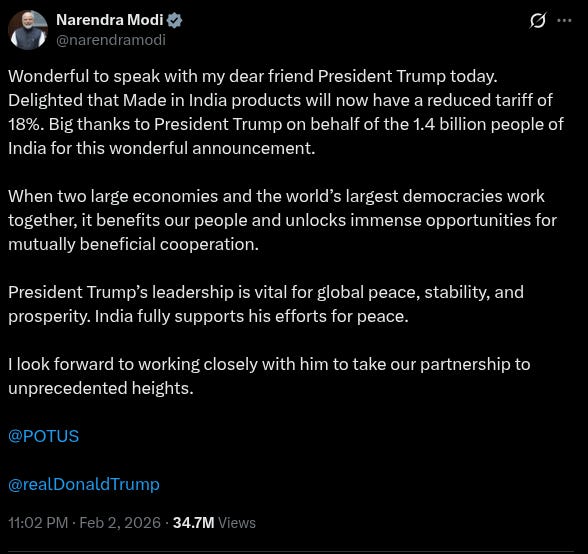 Then came the thaw. By December, India’s Russian oil imports had dropped to their lowest in two years. Talks between both countries were re-opened. And now, in February 2026, an interim trade deal was announced.