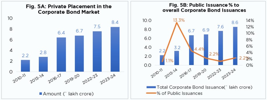 All of these leaves little incentive for anyone to go through the pain of a public issuance. As a result, 98% of capital raised through corporate bonds in FY 2024 came via private placements, which are negotiated bilaterally, and are invisible to the broader market. Public issuances, which accounted for 13% of the market a decade ago, have shrunk to just 2%.