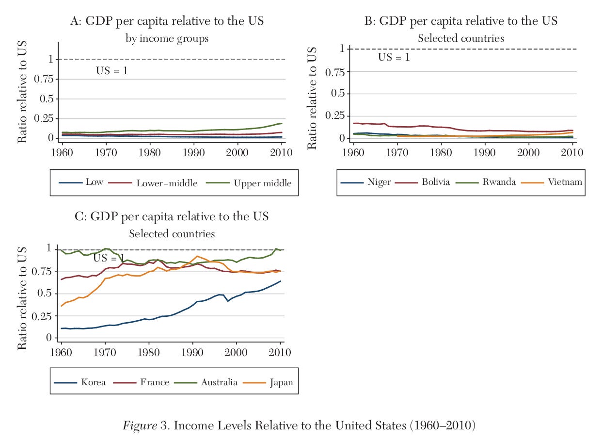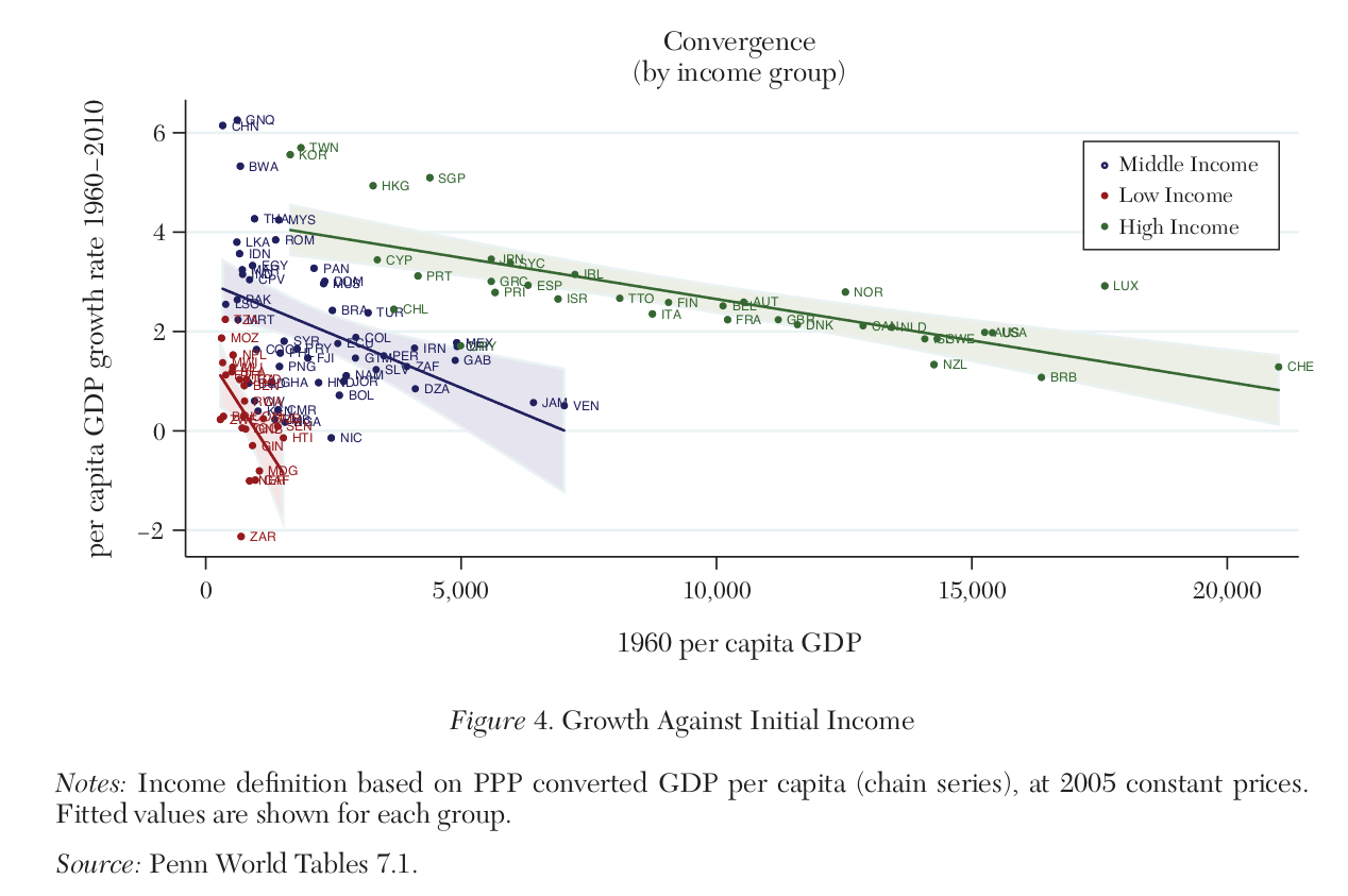 Instead of poor countries catching up, we've seen what economists call "convergence clubs." These are countries that started with similar income levels in 1960 and still had similar income levels in 2010.