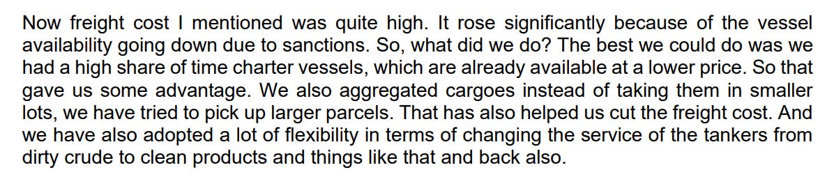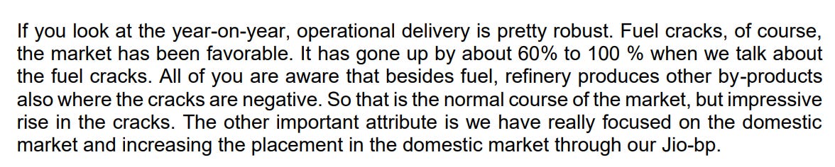 This quarter saw an extraordinary improvement in the numbers. But this improvement had less to do with internal company productivity, and was more a function of global fuel markets. Refining margins rose because global supply tightened, as several refineries outside India were shut down or disrupted due to maintenance or geopolitical turmoil. Meanwhile, shipping constraints simultaneously pushed up freight costs and limited the availability of vessels.