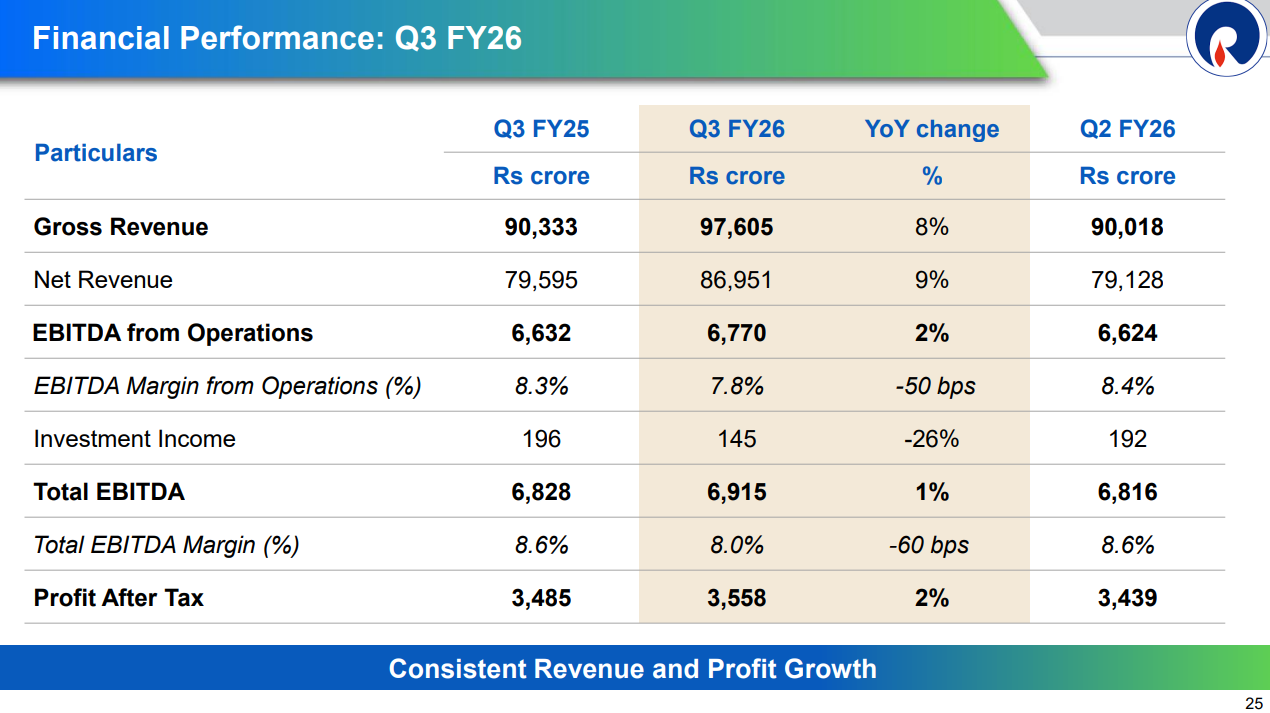 Reliance Retail reported quarterly revenue of ~₹97,600 crore, up ~8% year-on-year. EBITDA, however, was largely flat at around ₹6,900 crore. In simple terms, the retail business is selling more, but it isn’t making much more money.