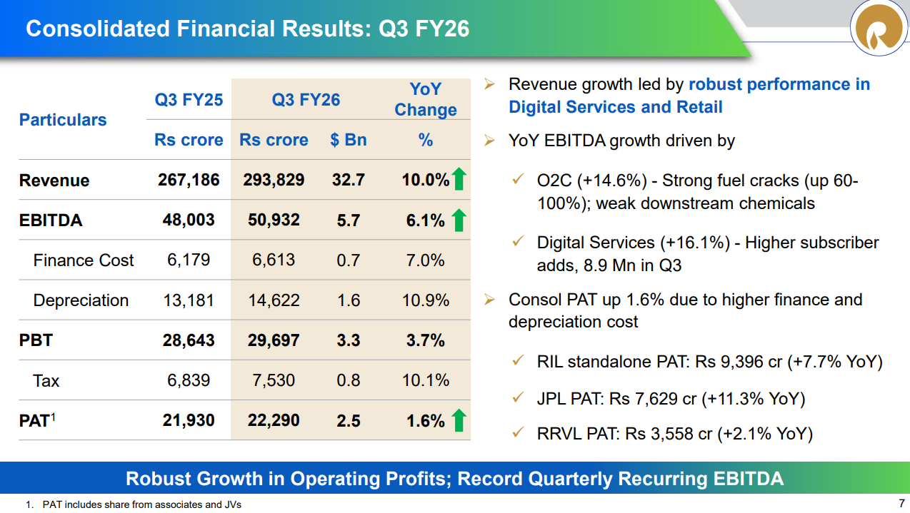 There were a few other things in the results we haven’t spent much time on. For one, advertising spends stayed weak during the quarter, which hurt media revenues, even though viewership on JioHotstar was strong. The consumer brands business, RCPL, also continued to grow, reporting ~₹5,000 crore in quarterly revenue, but this is still a business where Reliance is spending to scale rather than focusing on profits.