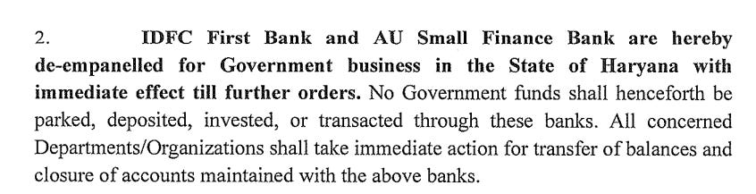 On February 18, the Finance Department of the Haryana government issued a notice revising its guidelines for dealing with banks. In that notice, it explicitly stated the “de-empanelment of IDFC First Bank and AU Small Finance Bank for any Government business in the State of Haryana.”