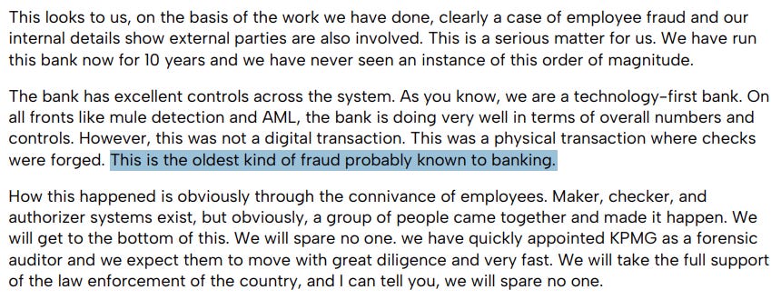Another tension in this case was that this fraud took place despite high levels of digitalization in banks. In previous calls, management emphasized being highly digitized, with 98–99% e-KYC, e-mandates, and so on. Yet this fraud bypassed digital rails entirely, happening through physical instruments. No matter how advanced digital systems are, legacy physical processes remain weak spots, especially when human collusion enters the picture.