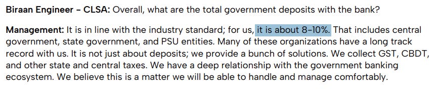 So yes, private banks do get government business. In fact, for IDFC First Bank, total government-related deposits — central, state, PSU combined — are about 8–10% of total deposits, broadly in line with industry standards.