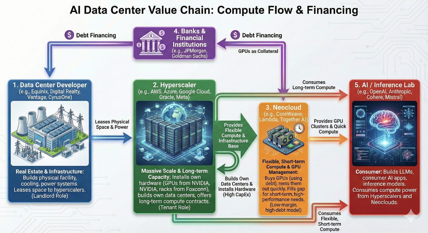 That’s where neoclouds — like CoreWeave, Lambda and Crusoe — enter. They don’t build cloud infrastructure. Their entire business is based on the physical buying and renting of GPU capacity. They take huge loans to buy GPUs, set up shop in leased data center spaces, and rent out GPU power, often on short-term, flexible terms. These neoclouds are now among NVIDIA’s biggest customers.
