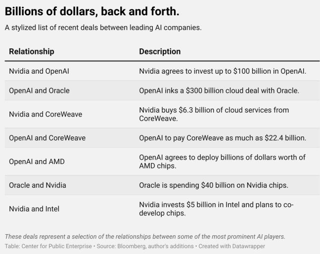 The third risk is strange. You’ve probably seen this Bloomberg illustration yourself, of circular financing in AI. The industry is marked by these weird dynamics: Company A invests in Company B, which spends at Company C, which buys from Company A.