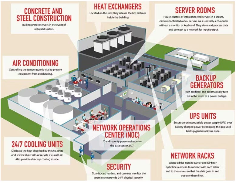 First comes the data center building, built by a data center developer. These buildings, called powered shells, are pretty different from other types of buildings. They need huge cooling units, electrical systems that can handle massive power loads, stable internet connection, robust power backups, and heat-resistant construction. A developer takes the responsibility of building all this, which takes a lot of money and know-how.