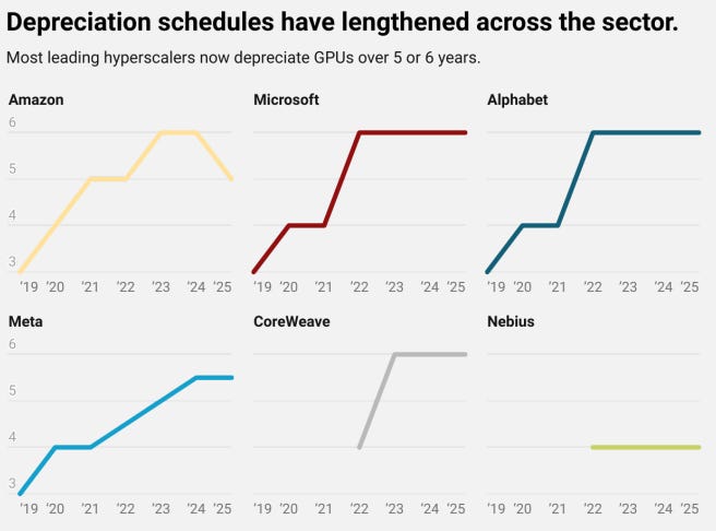 One way companies manage this is by simply showing their GPUs as depreciating over a long time. CoreWeave, for instance, depreciates GPUs over six years on its books, while Nebius uses four years. This is just a financial trick. It makes their financials attractive on paper, but it doesn’t extend how long those GPUs really last.