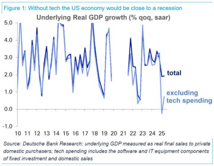 But so far, AI is replicating the worst tendencies of a bubble. And, unlike dotcoms, there is little consumer demand to prop all this AI capex. If we fail to stem these risks now, then we might lose out on a lot of the advances we could make and have made. And more or less, as the report suggests, the US economy might enter a painful recessionary phase.