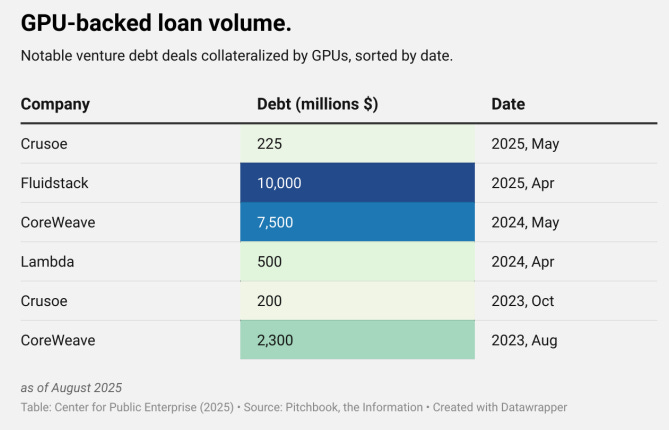 Unlike Big Tech hyperscalers, neoclouds aren’t running cash-rich businesses. They take loans from banks and buy GPUs. Those same GPUs become the collateral they provide for those loans. If revenue doesn’t catch up before loans come due, then not only does neocloud business get stressed, but even lenders take a massive loss on their collateral.