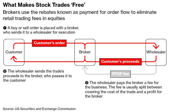 In the US, though, brokers have a lot more flexibility. They’re either registered as broker-dealers, which means they can act as an agent (that can send your order to an exchange), or as a principal (that can take the other side of the trade themselves), or they can send it to a third party market-maker for execution. Most large US brokers, including Robinhood, Charles Schwab, and Interactive Brokers, are broker-dealers. And most of the time, for retail orders, they choose option three.