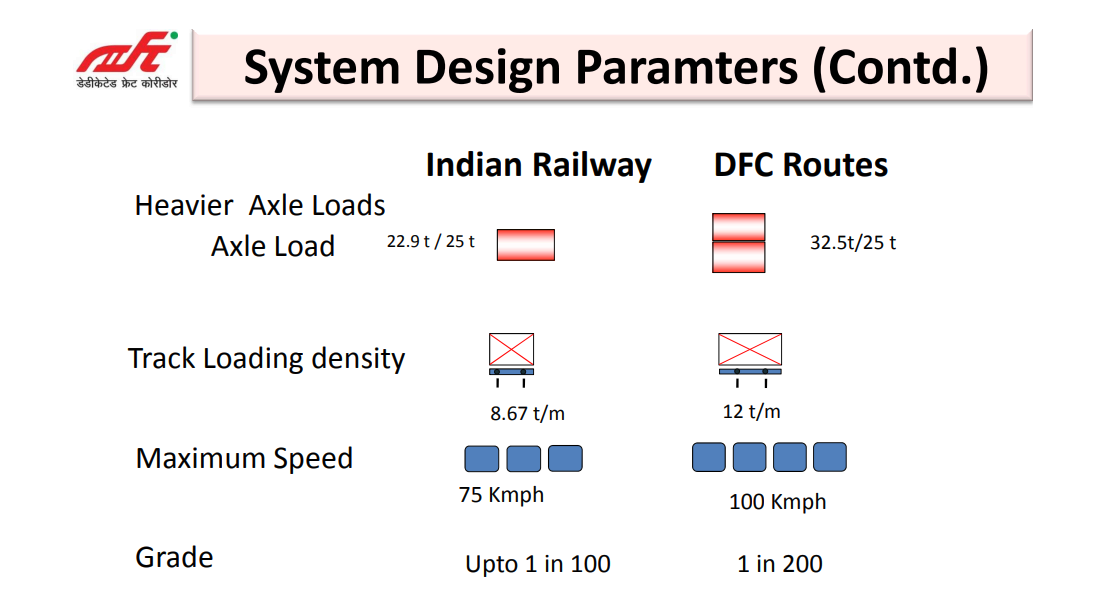 The first major upgrade is around the axle load. It refers to the weight pressing down on the track through a single axle of a wagon. The conventional network was designed for axle loads of 20–23 tonnes. The DFCs, in contrast, are built for 25 tonnes, with infrastructure designed to eventually support 32.5 tonnes. Heavier axle loads mean each wagon can carry more, which means fewer wagons per shipment, and therefore lower cost per tonne.