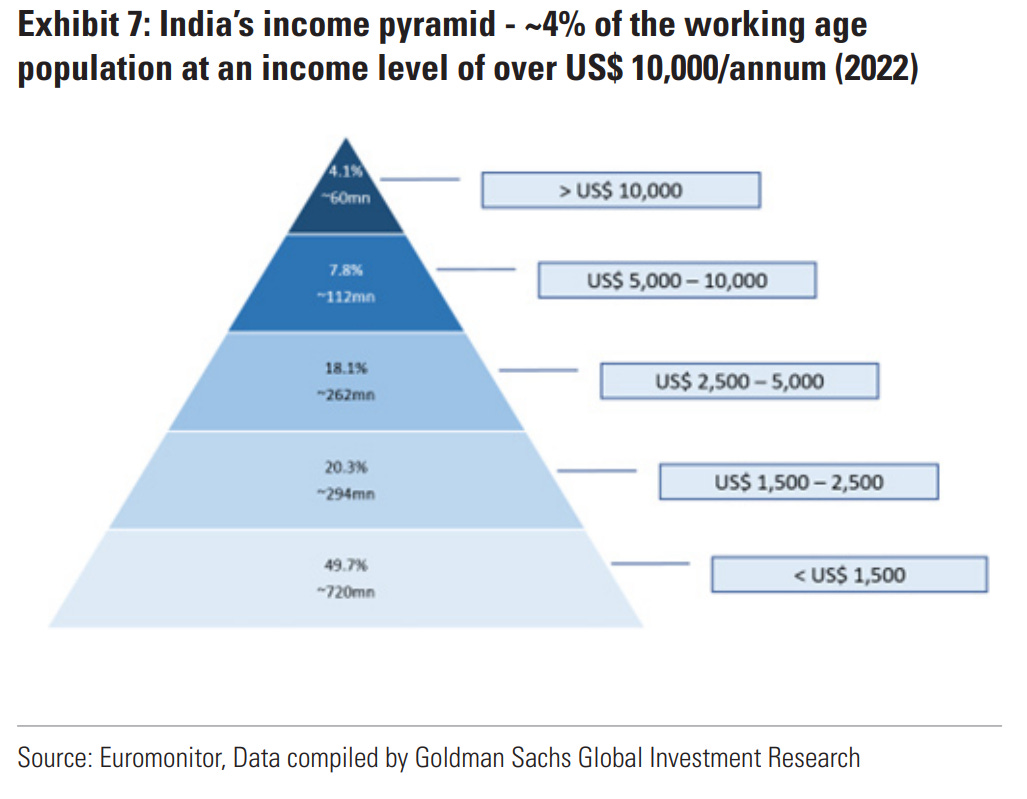 Roughly the top 10% of India’s income pyramid consists of the wealthiest consumers, who are early adopters of new trends and premium products. But there’s another fast-growing segment—the next 30%—which includes around 400 million people. This group has rising disposable incomes and is shifting from buying essentials to aspirational products. Importantly, this demographic is no longer confined to major cities.