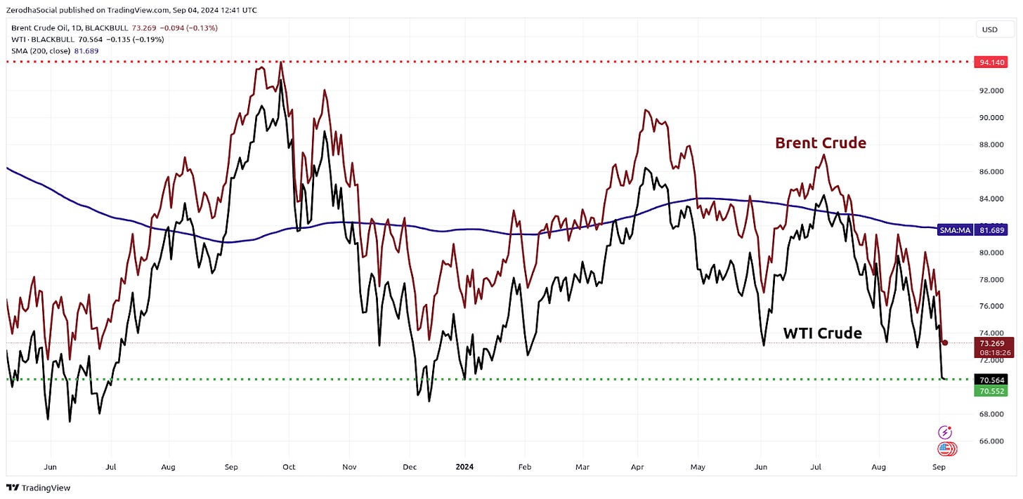 Crude oil prices have recently plunged to nine-month lows. WTI crude is down about 6.48%, while Brent has fallen 4% in the past five days. Brent is now hovering just above $73 a barrel, erasing all of this year's gains.