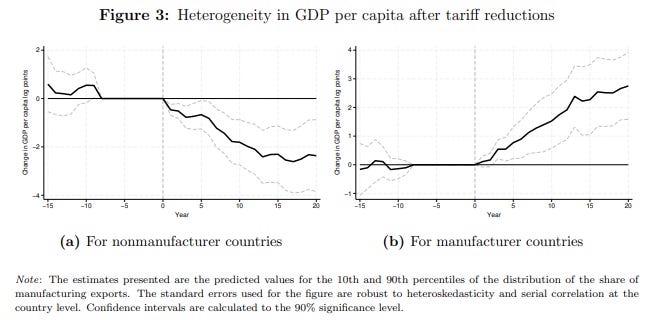 But this story isn’t all that rosy. A paper by economist Mateo Hoyos puts an important caveat to this — the effects of increased trade on growth depend critically on what a country makes. For countries making a lot of finished, manufactured goods, increased trade boosted GDP per capita significantly. But in economies dependent on exporting primarily raw material for finished goods, trade liberalization was associated with far slower growth.