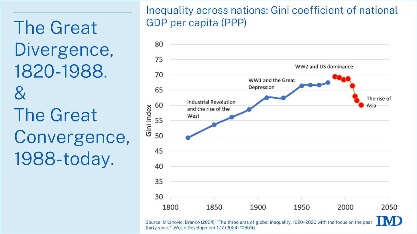The past three decades witnessed one of history's most dramatic economic transformations. In the last 3 decades, global income inequality between countries fell drastically as billions of people in Asia, and parts of Latin America and Africa, escaped poverty.
