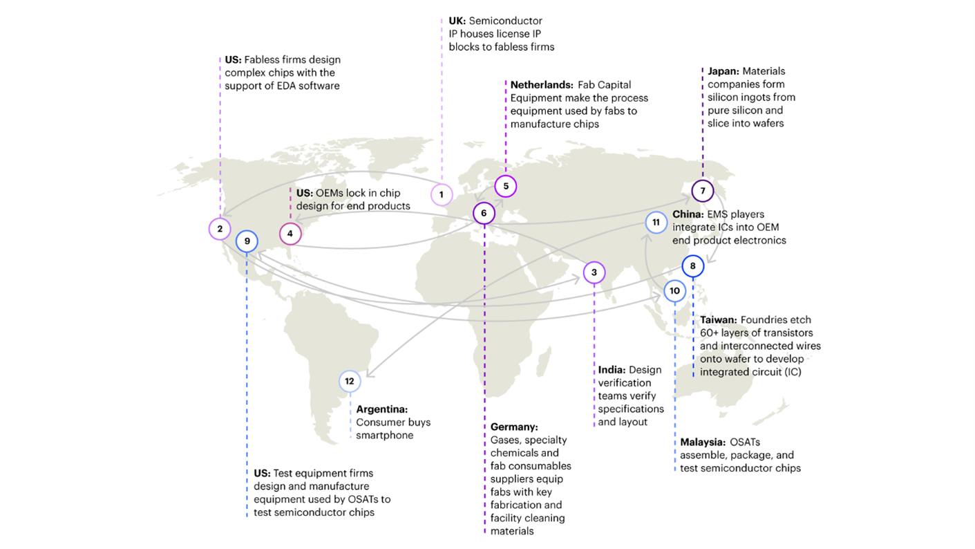 Here’s an image showing the GVC of a semiconductor chip. It’s truly emblematic of this second unbundling, requiring massive coordination between many parts of the world.