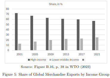 The economic logic of efficiency increasingly conflicted with political and security concerns. Rising competition from developing nations — especially China — meant that the US felt the need to protect their industries. The share of exports from advanced economies has been falling while exports from low-to-middle income countries have been rising.