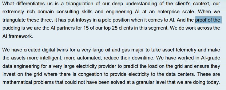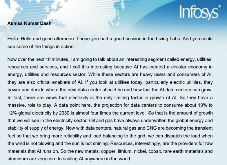 In Infosys’ view, AI growth is driving massive investment into energy, utilities, and resources companies. These companies themselves need AI to optimize grids, predict loads, manage complex supply chains, do predictive maintenance on assets, etc. They also have enormous ERP-heavy, legacy-heavy IT estates that need modernization.
