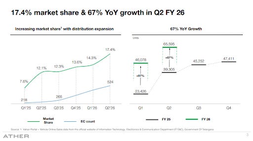 Ather sold ~65,600 units — up 67% year-on-year — to record sales worth ₹941 crore. It increased its market share from 12.1% last year to 17.4% this year. While the company isn’t yet profitable, it’s burning less money than before, with EBITDA margins improving to -10% from -21% a year ago.