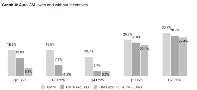 Bajaj Auto was a big beneficiary this quarter. They could potentially claim ₹630 crore in PLI incentives this year — the highest among all automakers, four-wheelers included. The company had submitted 13 PLI applications for different Chetak models and got all of them approved. This helped boost their margins from the vehicle.